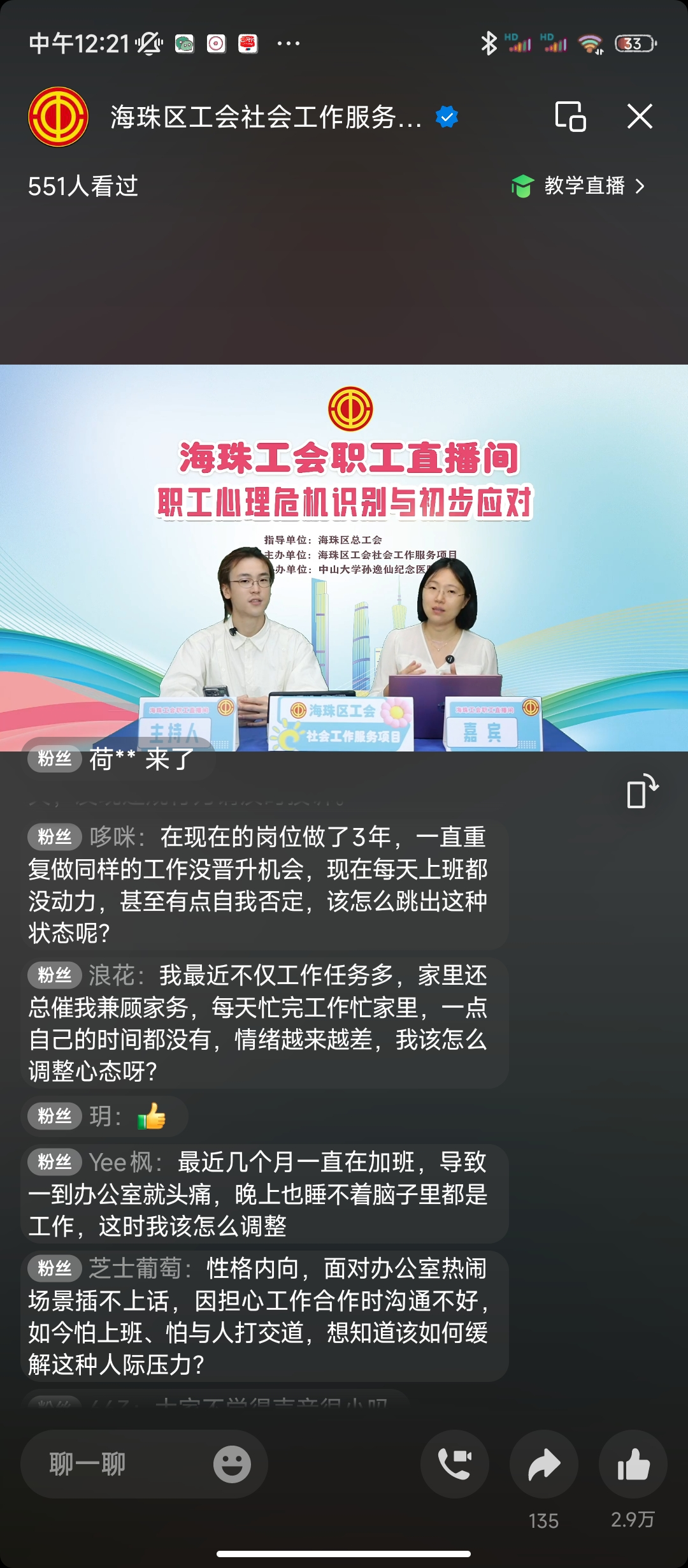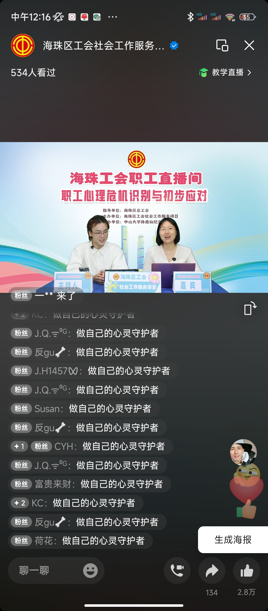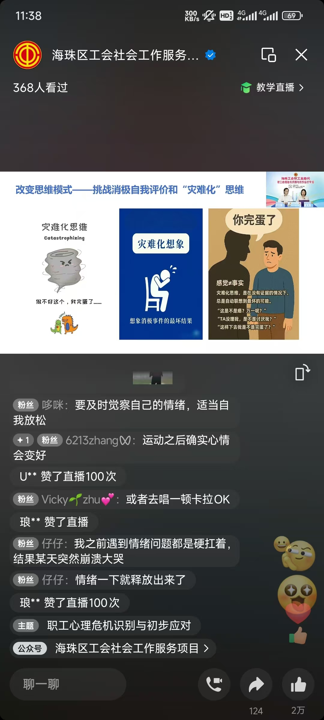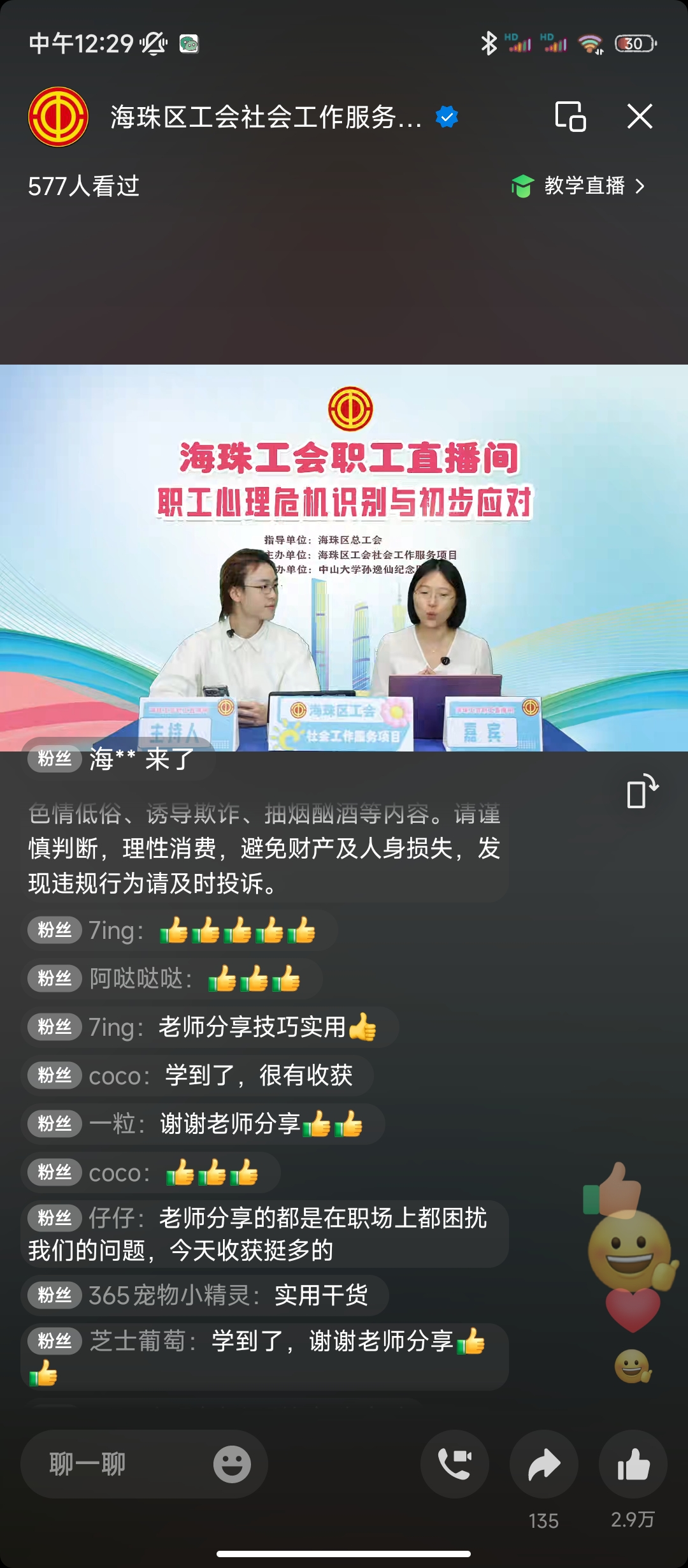 为进一步构建和谐劳动关系,提升职工心理健康素养,在海珠区总工会的指导下,9月27日上午10点,海珠区工会社会工作服务项目(广州粤穗社会工作事务所承接)、海珠区工会『联系广泛服务群众』体系实践中心“职工直播间”在视频号活力开播。直播全程高能不断,持续一个多小时,吸引六百二十人在线观看,收获评论留言1006条,点赞数29987次。