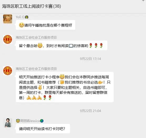 为积极响应全民阅读号召,丰富职工精神文化生活,9月22日至10月12日,海珠区工会社会工作服务项目(广州粤穗社会工作事务所承接)、海珠区工会『联系广泛服务群众』体系实践中心联合举办了一场别开生面的“悦读赋能 书香筑梦”海珠区职工线上阅读打卡赛。