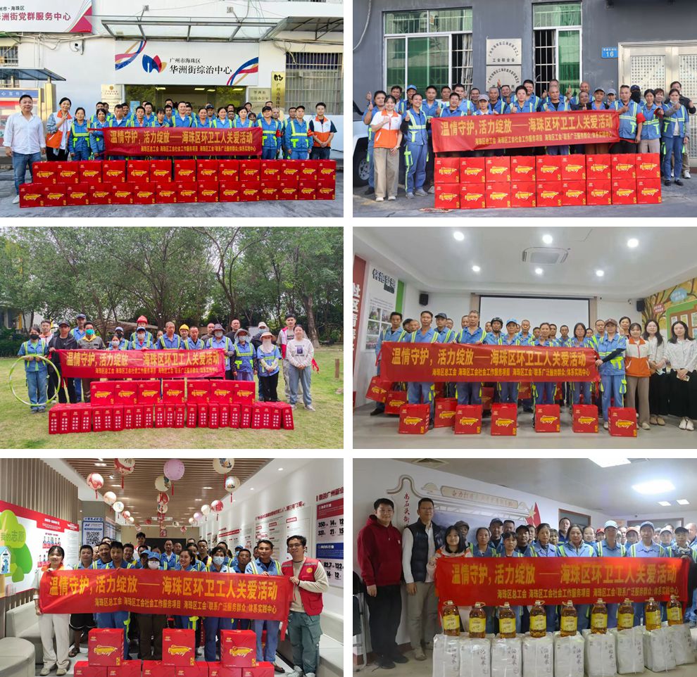 10月31日至11月19日,粤穗海珠区工会项目开展“温情守护,活力绽放——海珠区环卫工人关爱活动”,覆盖凤阳街道、南石头街道、南洲街道、华洲街道、江海街道及赤岗街道等多个户外劳动者工会爱心驿站,共服务180名环卫工人。