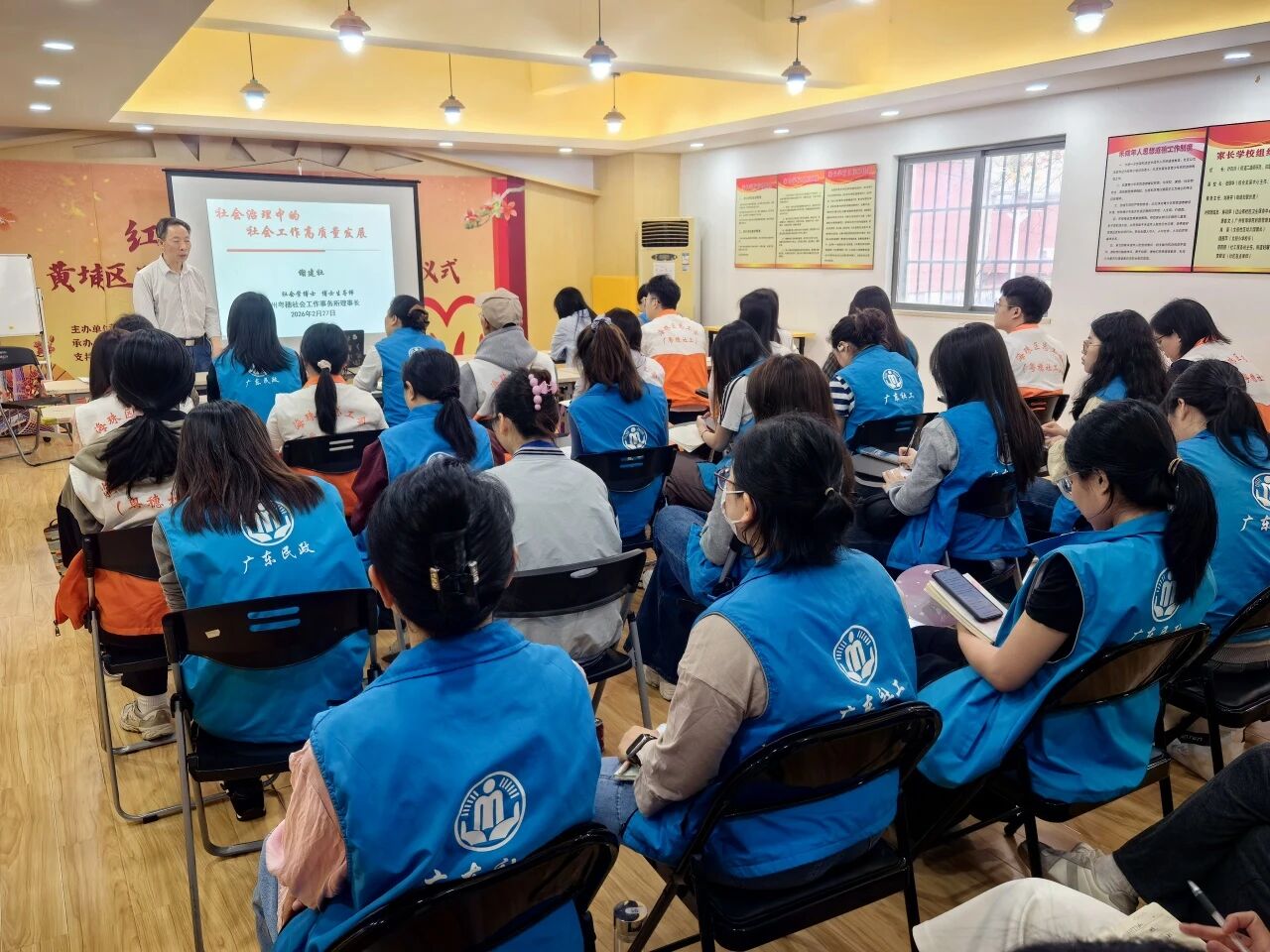 2026年2月27日上午,广州粤穗社会工作事务所(以下简称“粤穗”)在红山街社工服务站成功举办了2026年开年第一次专业培训会议。本次培训以“社会治理中的社会工作高质量发展”为主题,由广州大学公共管理学院教授、粤穗理事长谢建社主讲,全体社工参加了培训。