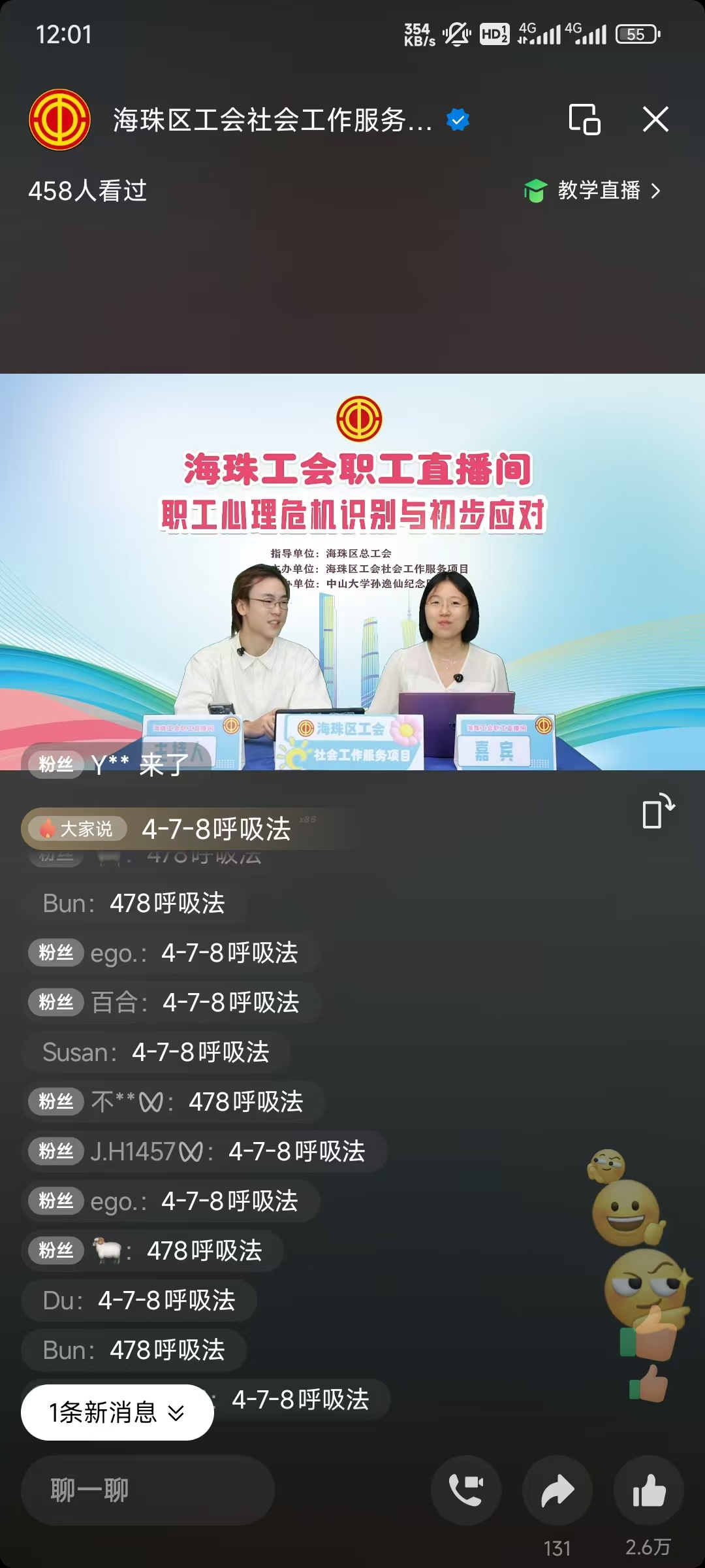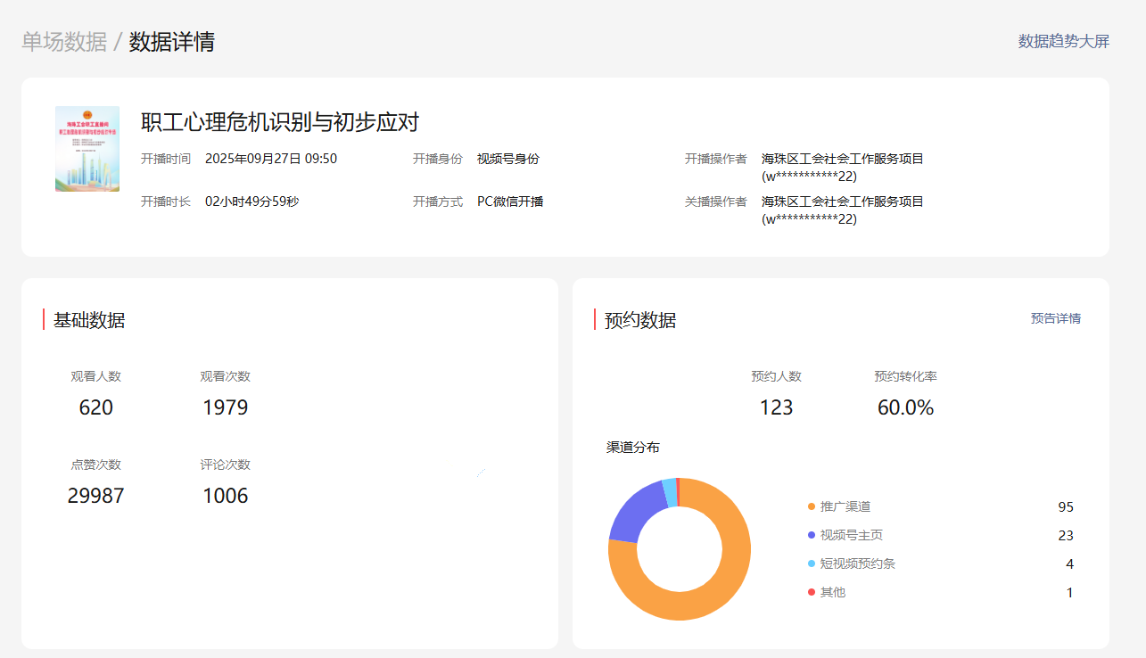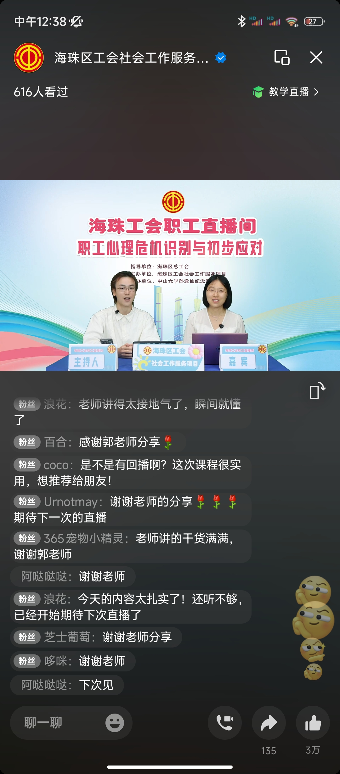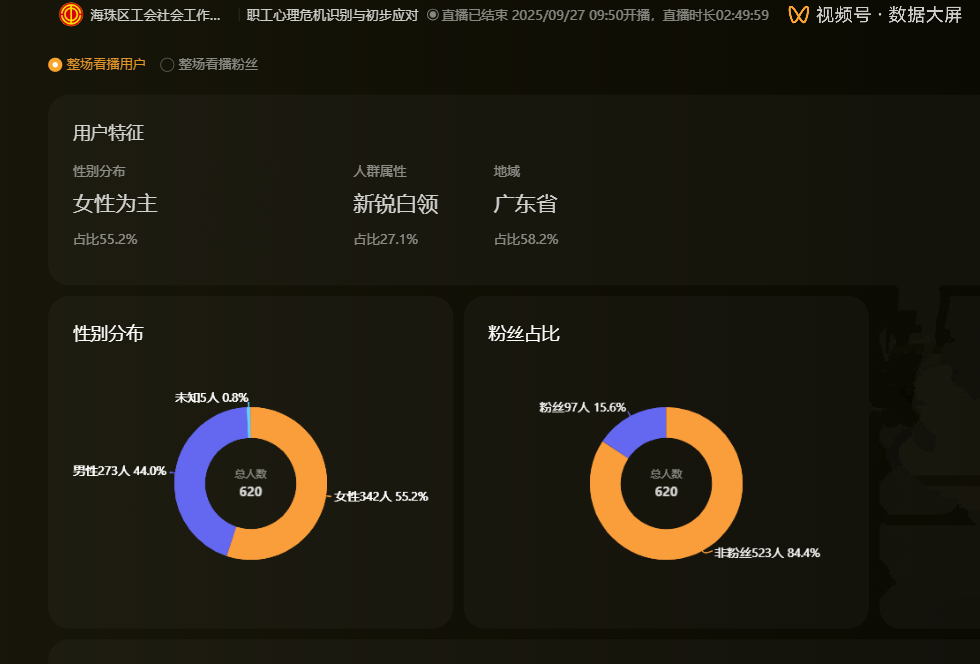 为进一步构建和谐劳动关系,提升职工心理健康素养,在海珠区总工会的指导下,9月27日上午10点,海珠区工会社会工作服务项目(广州粤穗社会工作事务所承接)、海珠区工会『联系广泛服务群众』体系实践中心“职工直播间”在视频号活力开播。直播全程高能不断,持续一个多小时,吸引六百二十人在线观看,收获评论留言1006条,点赞数29987次。