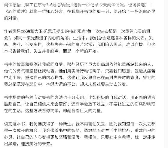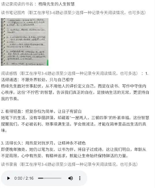 在为期三周的打卡赛程里,超过40名职工携手完成了一次从“职场赋能”到“红色之旅”,再到“心灵减压”的深度阅读探索,累计打卡次数519次,打卡阅读内容500余条记录。有的职工分享精炼深刻的读书笔记,有的上传工整的手写阅读感想,更有职工大胆尝试,通过录制音频或视频,声情并茂地朗读经典段落、分享心得感悟。这种多元化的互动形式,将单一的阅读行为转化为一场可听、可看、可感的视听盛宴,成功营造了一个充满活力的线上书香生态圈。