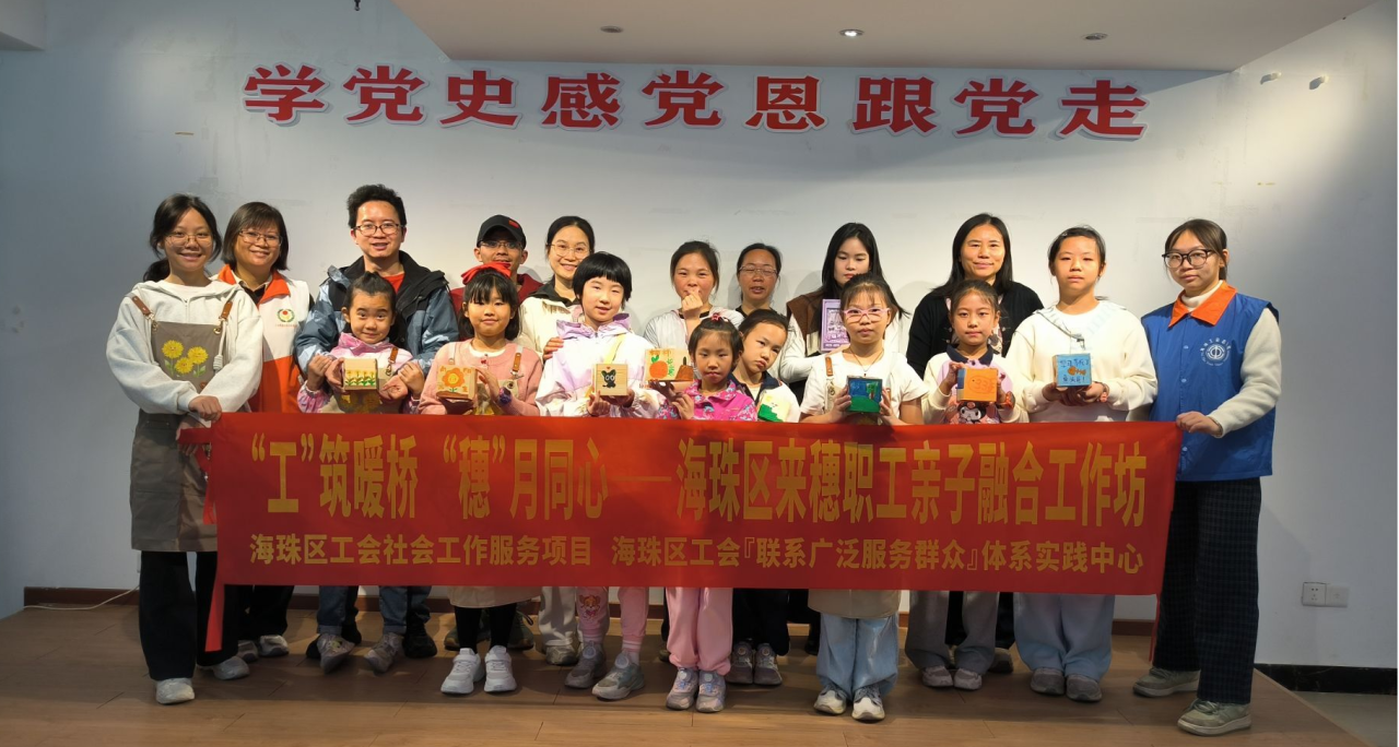 为助力来穗职工家庭深度融入城市生活,海珠区工会社会工作服务项目(广州粤穗社会工作事务所承接)、海珠区工会『联系广泛服务群众』体系实践中心,于2025年11月15日至30日面向6-12岁来穗职工亲子家庭,创新开展“‘工’筑暖桥 ‘穗’月同心”主题工作坊。工作坊以“文化浸润+情感联结+成长赋能”为核心,通过五场沉浸式体验活动,服务覆盖80人次,搭建起工会组织与来穗职工家庭的情感联结桥梁。