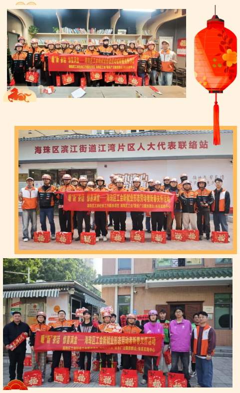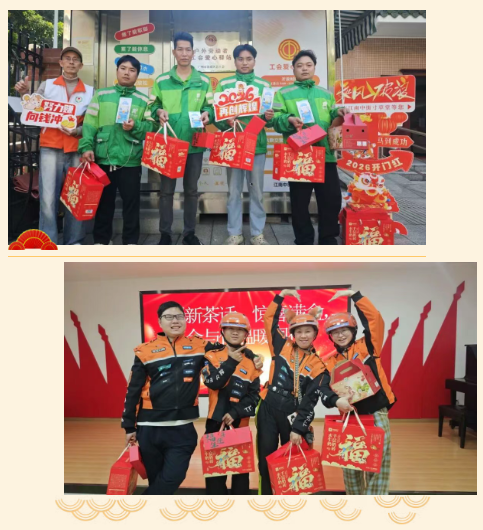 滨江街道(好百年)户外劳动者工会爱心驿站、(小红艇)户外劳动者工会爱心驿站,江南中街党群服务中心(新时代文明实践所)户外劳动者工会爱心驿站内暖意融融、笑声阵阵。 为让春节期间留穗坚守岗位的外卖骑手快递员等新就业形态劳动者感受到“娘家”温暖,在海珠区总工会的指导下,由海珠区工会社会工作服务项目(广州粤穗社会工作事务所承接)、海珠区工会『联系广泛服务群众』体系实践中心联合滨江街道总工会、江南中街道总工会共同开展的“暖‘新’茶话・惊喜满盒”海珠区工会新就业形态劳动者新春关怀活动温情启幕,近80名新就业形态劳动者在温馨热闹的氛围中喜迎佳节。 活动以“热茶+盲盒”的创新形式,传递出浓浓的年味与真情。现场,骑手们通过抽取装有“平安”“吉祥”等关键词的创意红包,分享家乡年俗,迅速拉近了彼此距离。随后,工会社工为每人送上热茶,让新就业形态劳动者直言“心里暖和”。 茶香氤氲中,大家围坐畅谈,分享跑单路上的感动瞬间与留穗过年的计划。活动还特别设置了“新春心愿盲盒”和“祝福声声”录音亭环节——手写祝福卡传递陌生温暖,方言录音留存新春寄望,形式新颖且充满心意。最后,全体人员手持礼物、共举热茶合影,齐呼“工会与你温暖同行”,为活动画下温馨句号。 此次活动不仅为留穗新就业形态劳动者送上了实实在在的关怀,更通过创设轻松温暖的交流场景,让城市“城市奔跑者”在异乡感受到“家”的温度,切实增强了新就业形态劳动者的归属感与幸福感。 2026 | HAPPY NEW YEAR